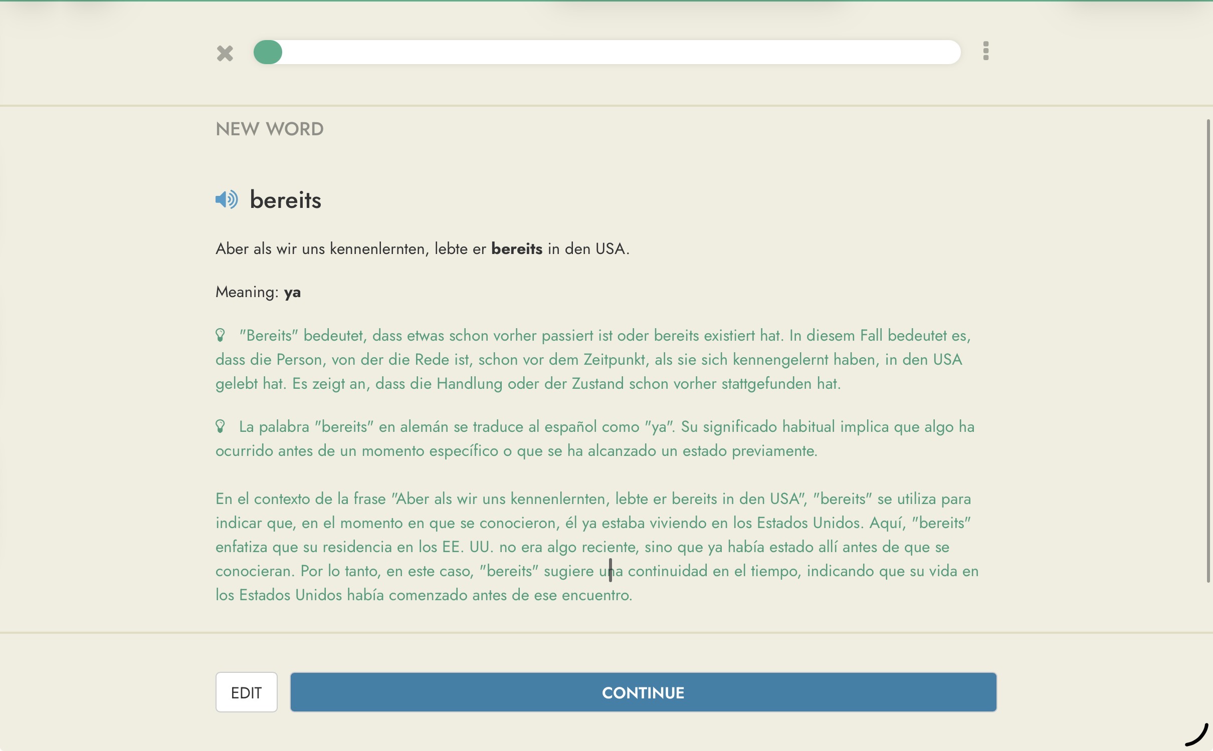 Second, the word explanations are inconsistent. Sometimes I get them in German, sometimes in Spanish, sometimes both mixed in the same step. When I’m still learning German, getting the explanation in German defeats the purpose.