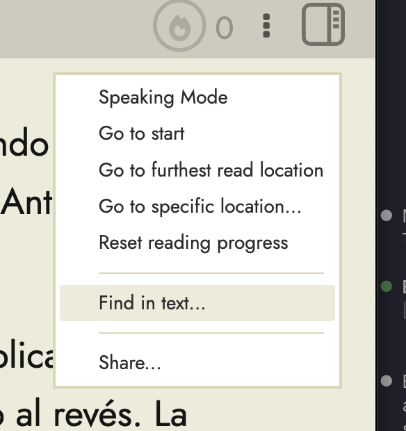 As a way to spend less time jumping between looking at the screen and looking at my book, I have been using the F+command button to quickly find the word within the transcript.