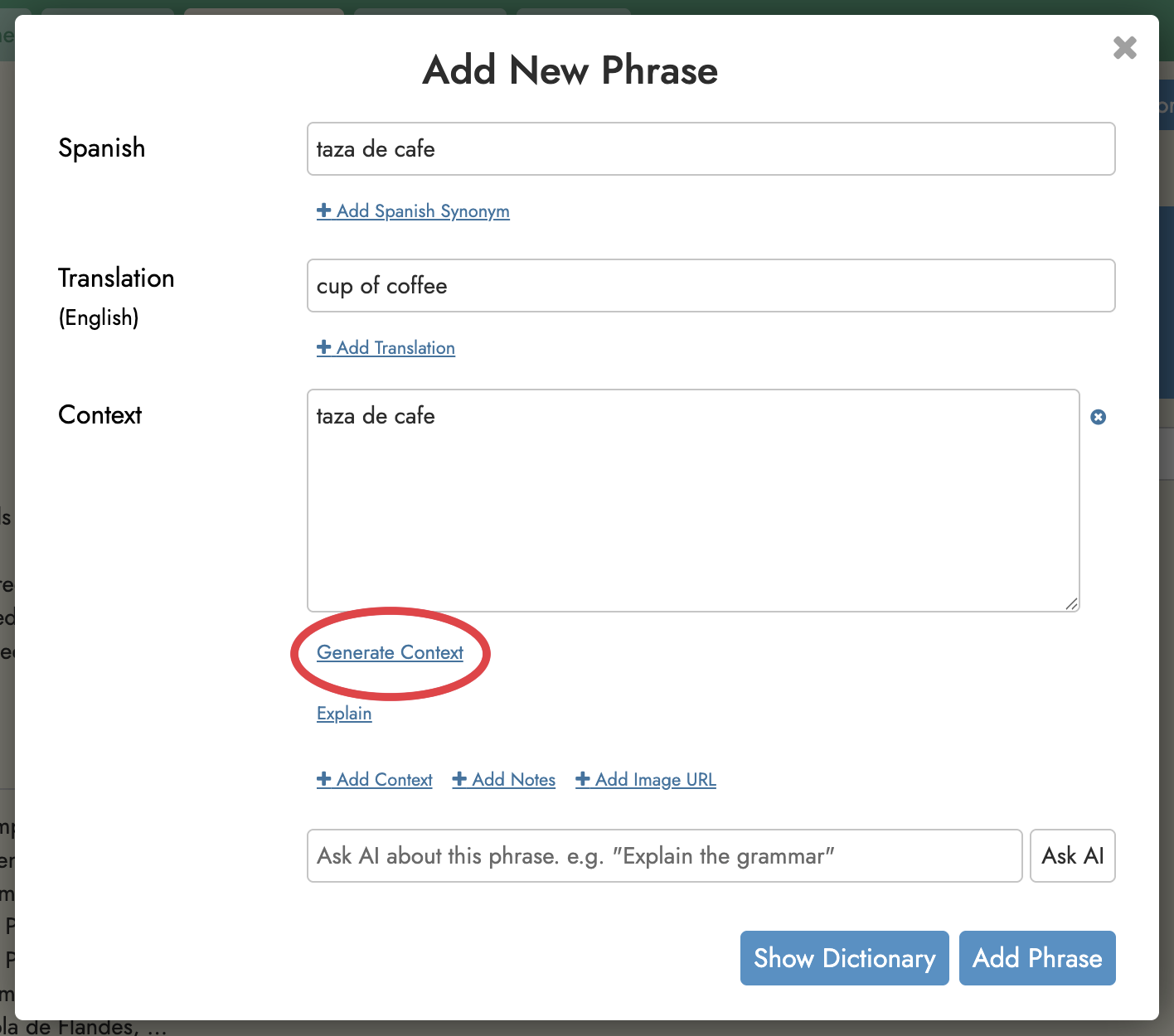 I used a lot searching and adding a new word from word list page. Because I add manually, there is no context, so I used ask AI feature with this prompt: