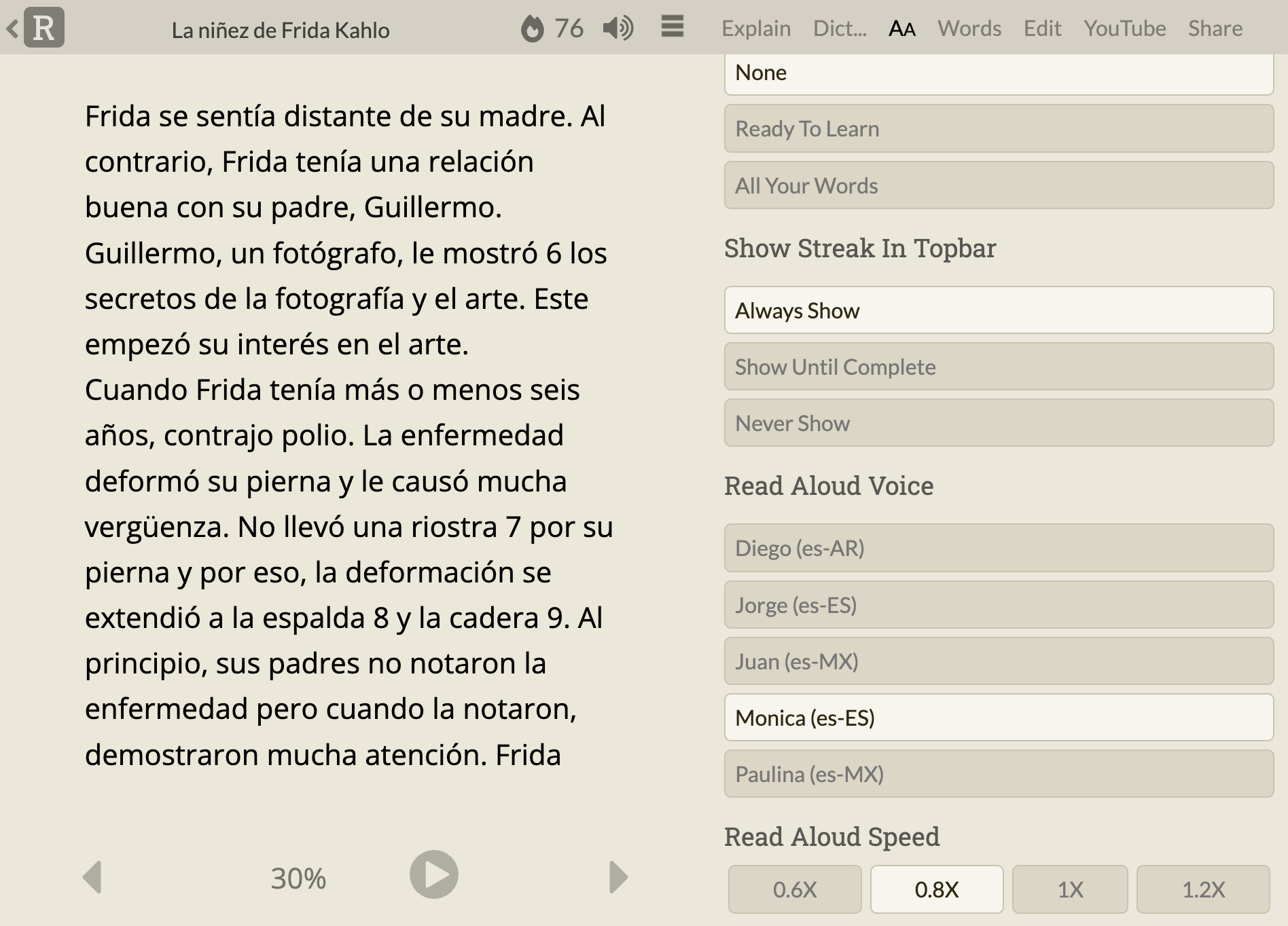 Note that the speed options do go down below 70%. The lowest option is currently 0.6X or 60%. And in fact, all these speeds are actually made 0.85 times slower than the stated speed. The reason for this is that the voices were designed for native speakers and I think for language learners playing at 0.85X seems a better default baseline, at least on the devices Iâve tested (remember that these voices are all provided by your browser/device), so when you play at 1X Readlang is telling your device to play at 0.85X behind the scenes, and when you play at 0.6X itâs really 0.5X behind the scenes.