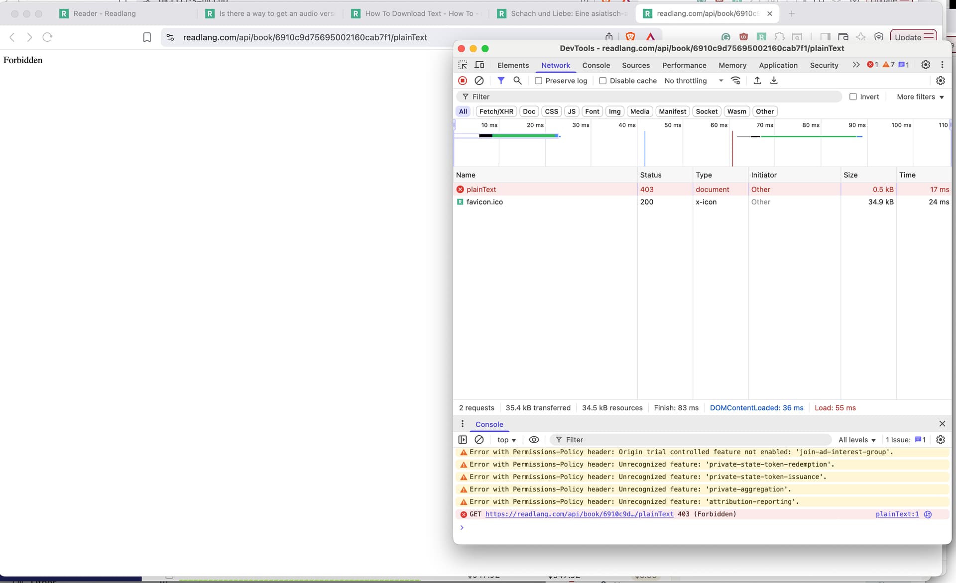 https://readlang.com/api/book/:bookID/plainText, keeping thebookIDas before. e.g. following the previous example: https://readlang.com/api/book/69063d8717bd61df06f641dd/plainText - this URL will fetch the entire plain text for the text in question.