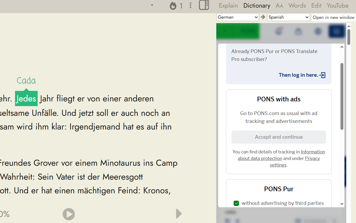 I am trying to use this dictionary because I am learning German, the problem is that I cannot click on the option accept and continue in order to use it.