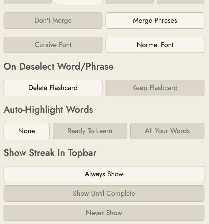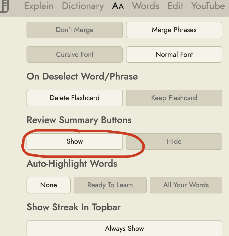 Finally I don’t see the option for Review Summary Buttons when I try to configure the reader? This would be an amazing feature on difficult texts.