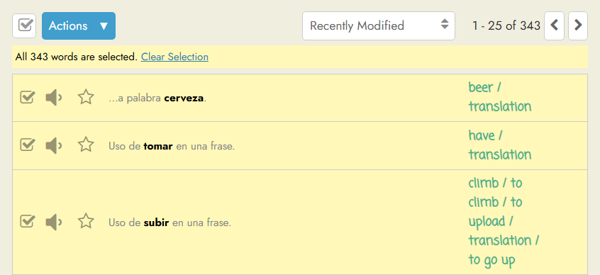 As you can see from the screenshot this solution selects all the words from my list and the words below show their original meaning plus the word “translation”: