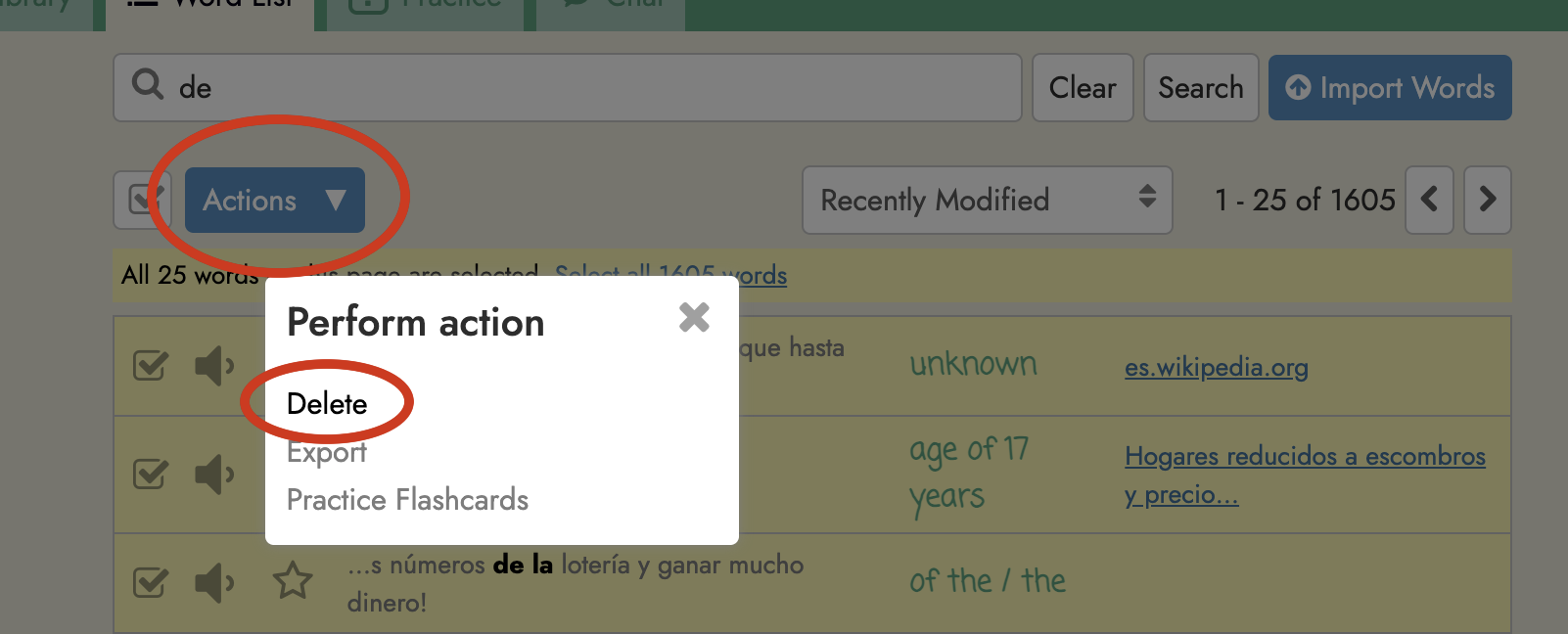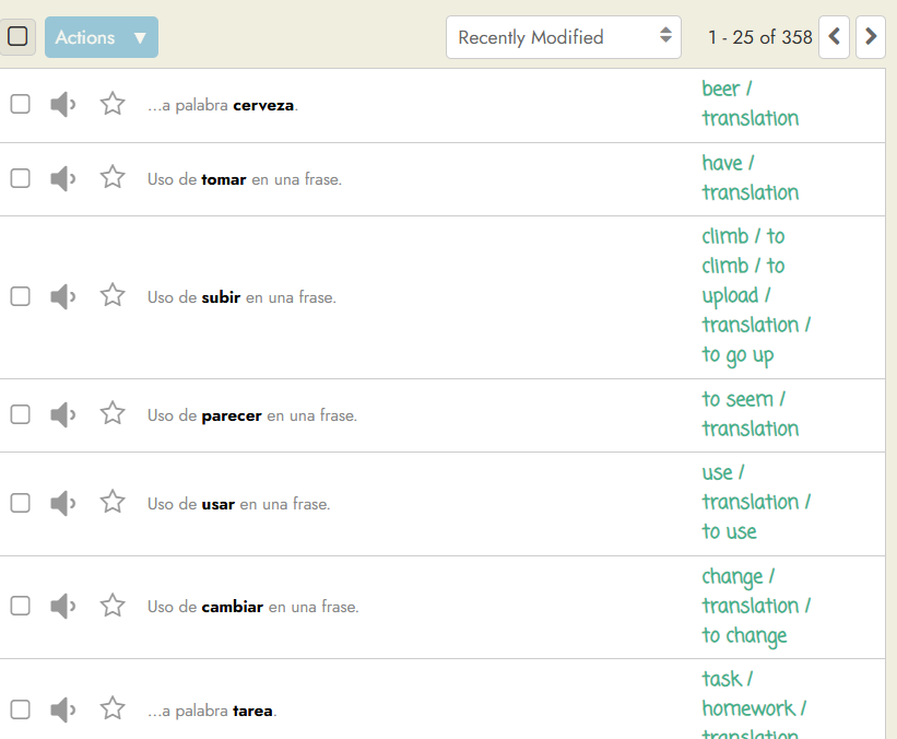 Note that “translation” was appearing because you have a lot of common words in your word list with “translation” as the translation. These appear to all have been imported at the same time on 6th December 2025 and have the appearance of being automatically generated. For example: