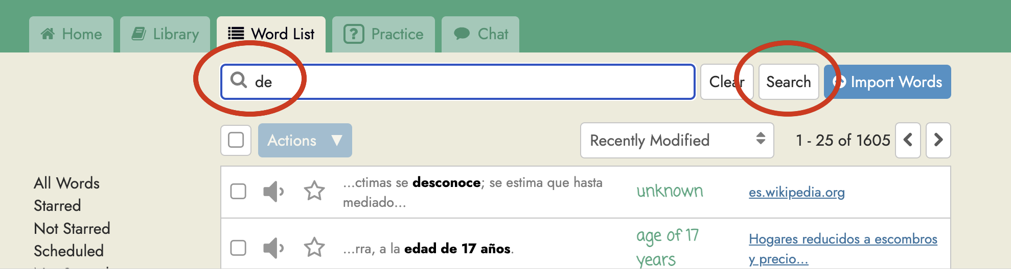 Hi Steve, thanks for looking into this matter. I created the words while reading a story from the Spanish library, by clicking on the words. Yesterday I read another story and the same happened only in some cases, when clicking on some of the individual words. When clicking on the same word togeher with another, i.e. a word pair, the problem did not show up. I hope this explanation helps, but let me know if you need more information. Thank you again