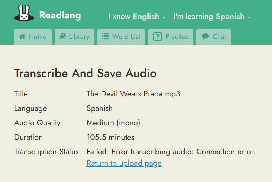 I managed to find the file you uploaded which twice failed to transcribe. I just tried uploading it and it worked. I’m not sure why it failed twice for you. I suspect it’s either the OpenAI API or the connection between the Readlang server and OpenAI being temperamental, and I wouldn’t be surprised if this is more likely to cause problems with with longer files, although apparently it can happen with any length of file.